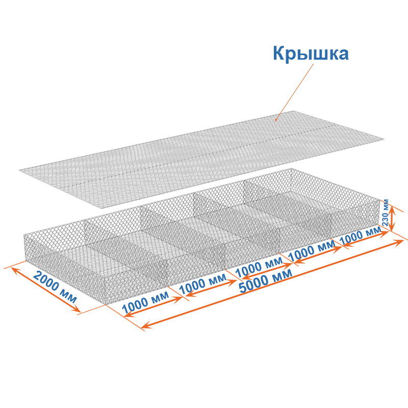 Матрасы Рено 5x2x0,23 — плоские габионные секции из сетки двойного кручения с ячейкой 60х80, проволокой 2,2 мм и покрытием Цинк.